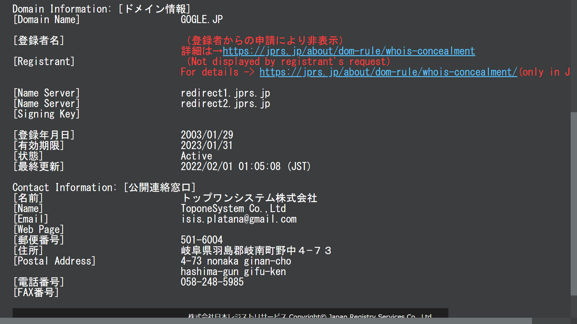 googl.jp。打ち間違えを利用し他のサイトへ誘導する典型的なドメインである。google関連で言えばgoggle.comが最も有名だろう。