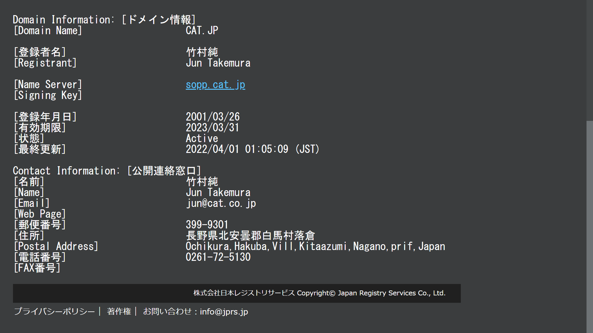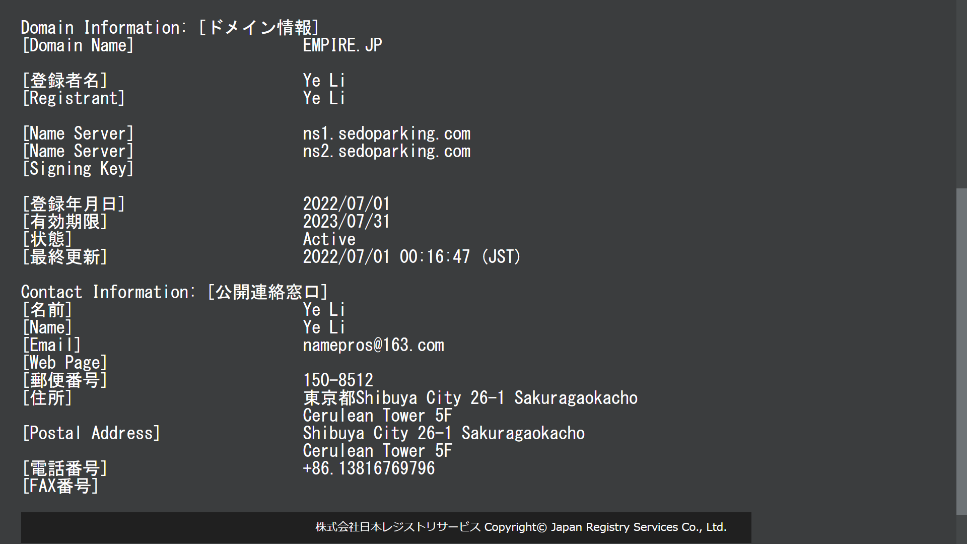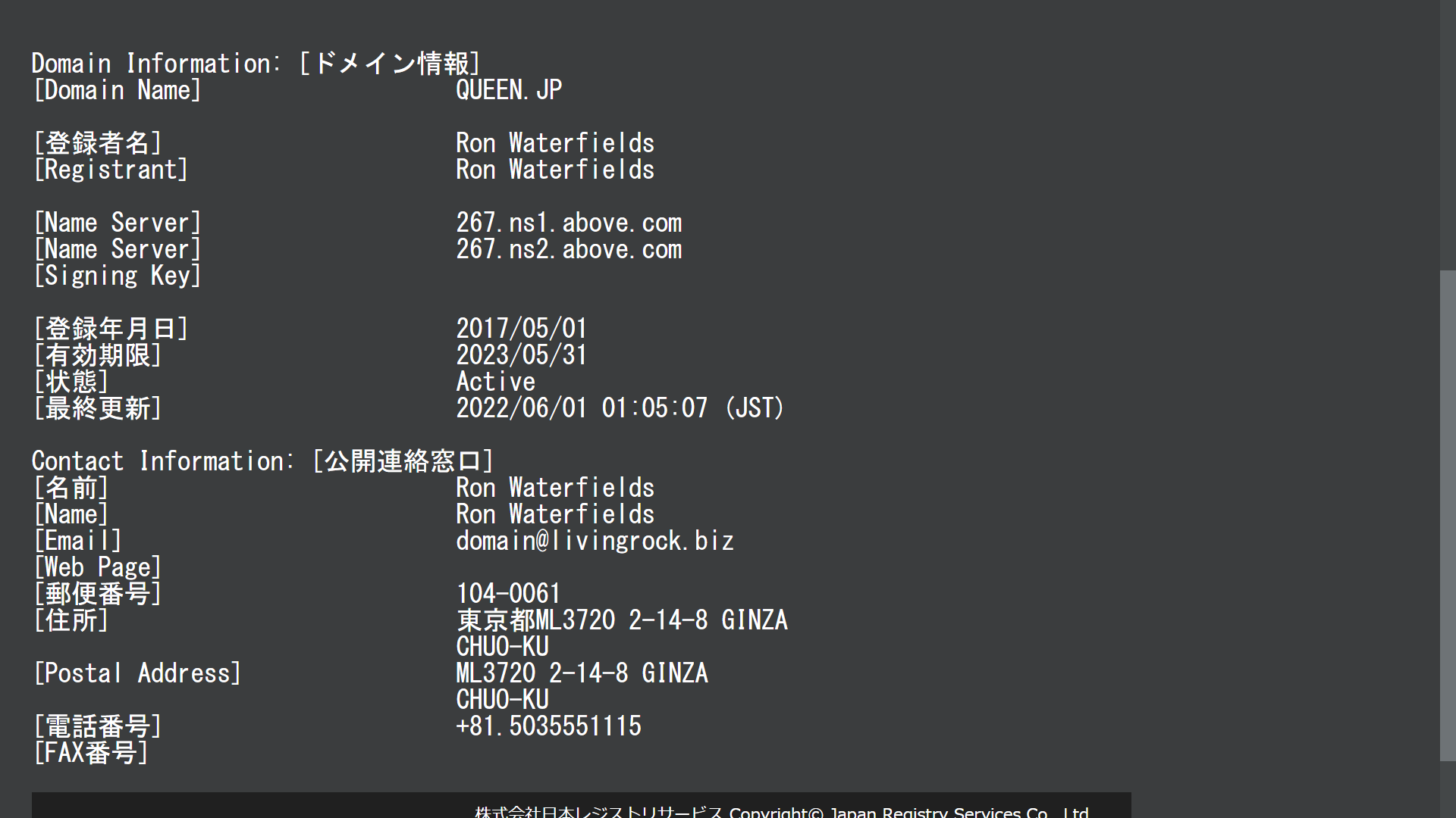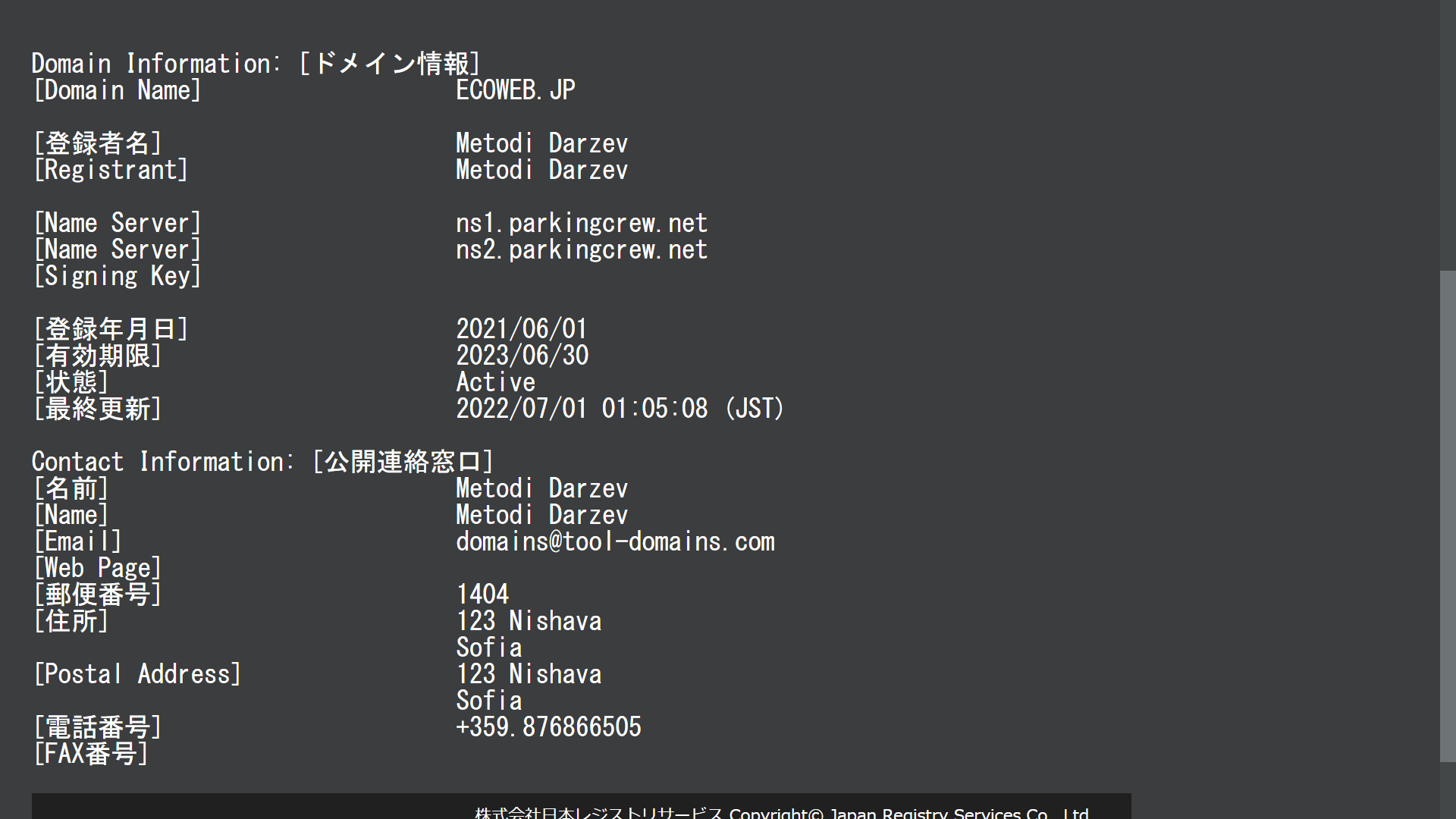 ここに売りに出されている複数の.jpドメインがある。これらのドメインをWHOIS検索にかけると、まれに以下のような外国人名義の氏名・適当に登録した偽の住所が表示されることがある。