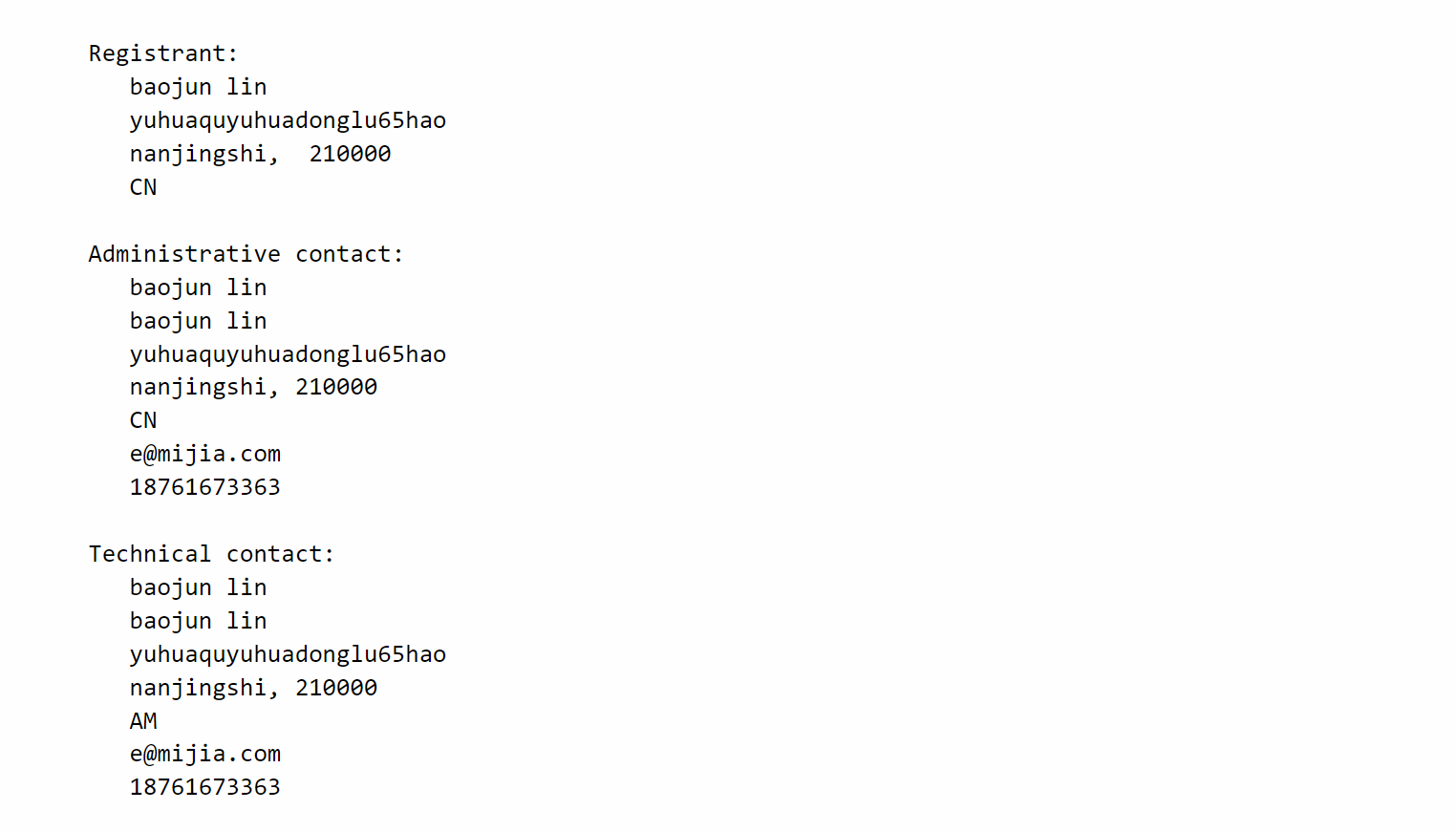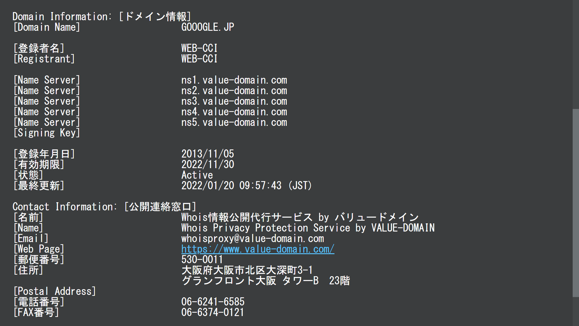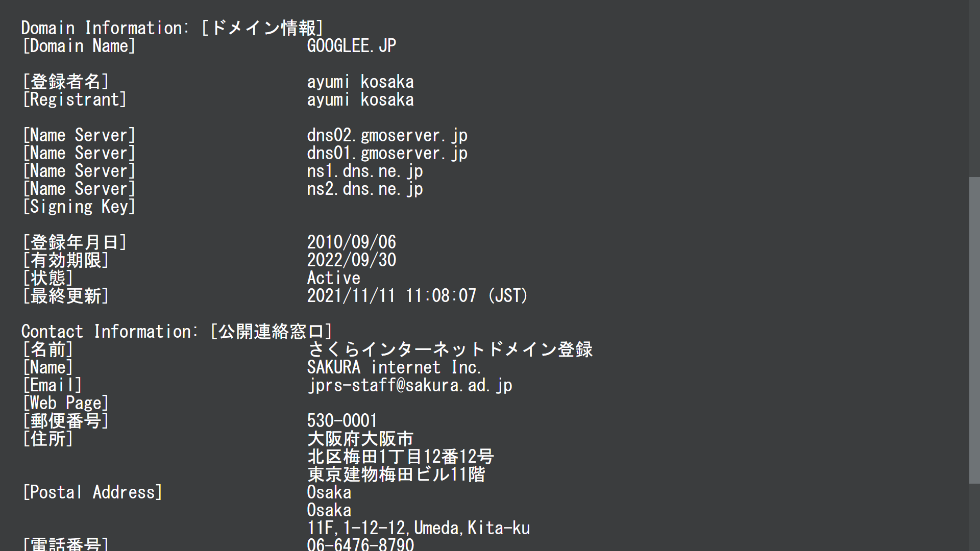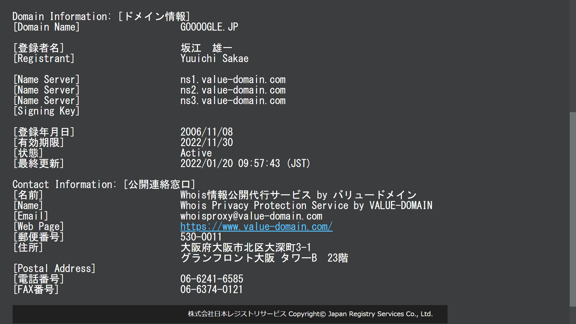 ここに売りに出されている複数の.jpドメインがある。これらのドメインをWHOIS検索にかけると、まれに以下のような外国人名義の氏名・適当に登録した偽の住所が表示されることがある。