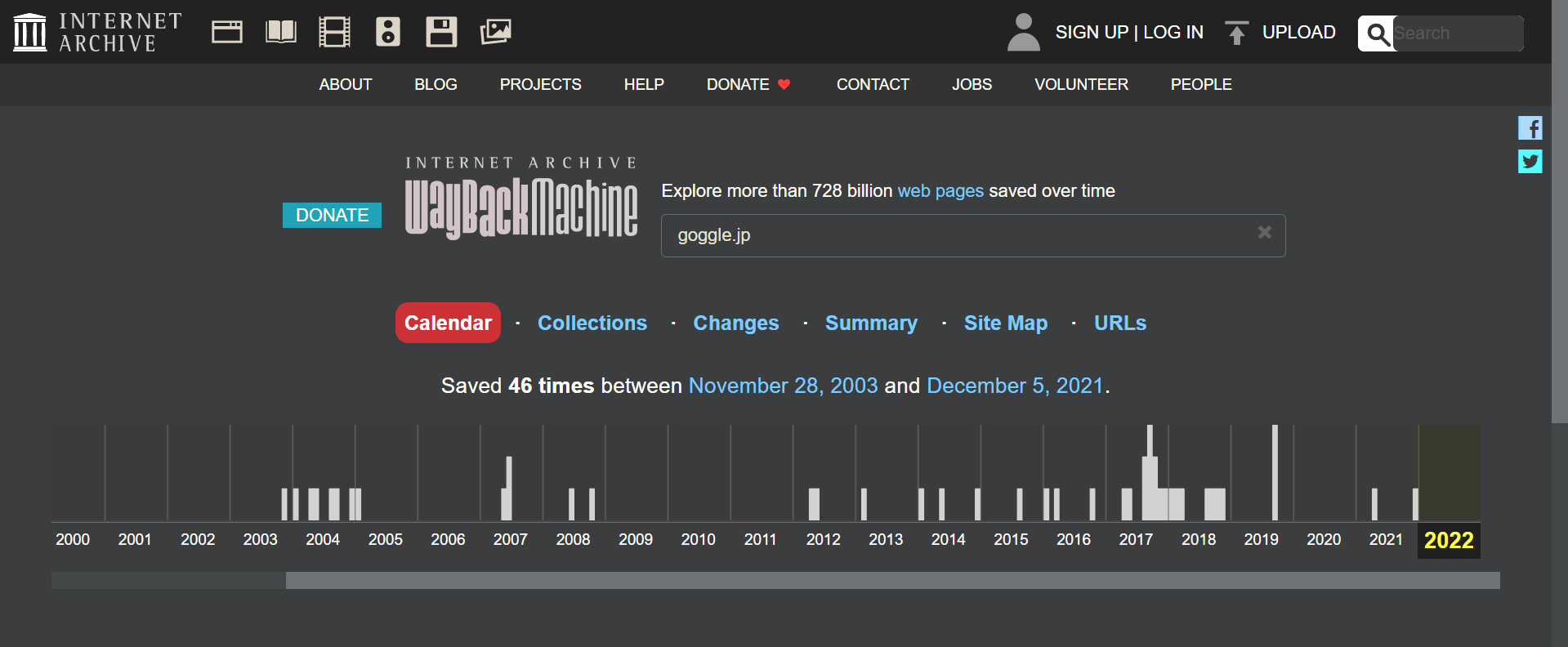 .jpが一般に登録可能となったのは2001年なので、最も古い登録データベースは2001年と表示される。